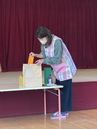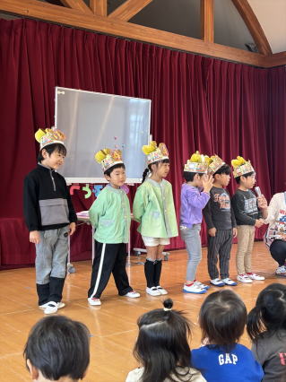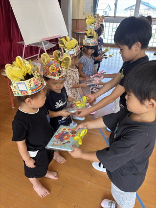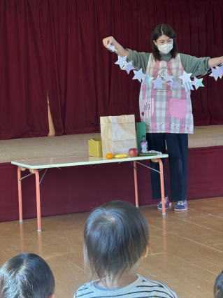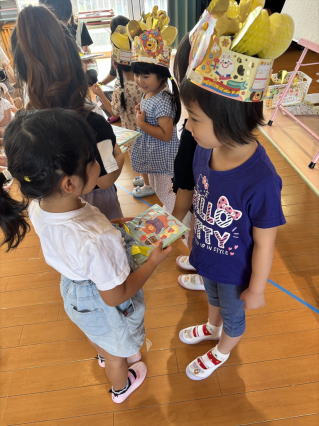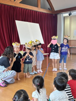 8月のお誕生会を行いました。4人のお友だちをお祝いしました。 出し物では、みんなで一緒に歌に合わせて体を動かしたり、 なんの料理ができていくのか楽しみなストーリーシアターを楽しみました。 そのあとは、とっても大きいスイカが登場し、みんなですいか割りをたのしみましたよ。