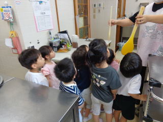 いつもおいしい給食を作っている給食室見学をしました。 お家で見るより、大きいお鍋やしゃもじに、みんなびっくりでしたよ