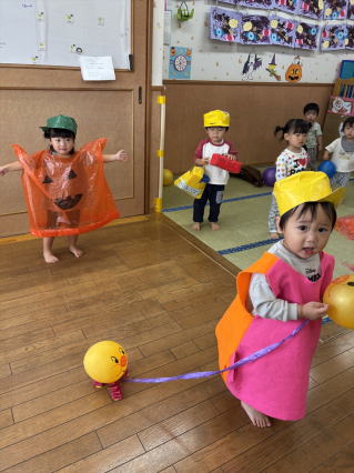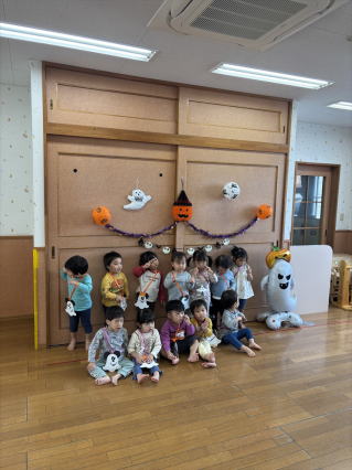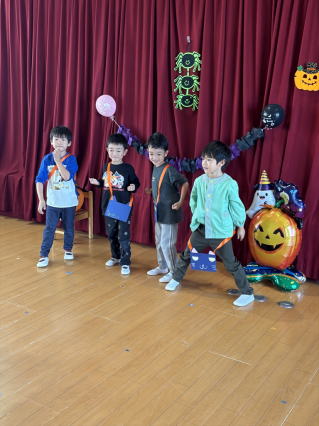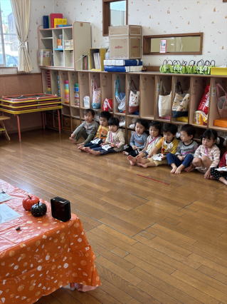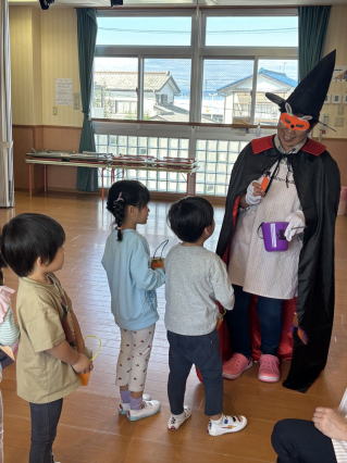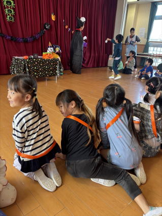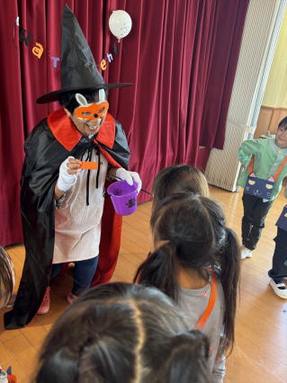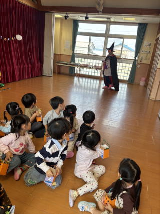ハロウィンの由来などの話を聞きいたら、、、優しい魔女が登場! みんなで「トリックオアトリート」が言えましたよ。 小さい子はハロウィン仮装などして楽しみましたよ