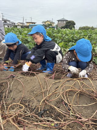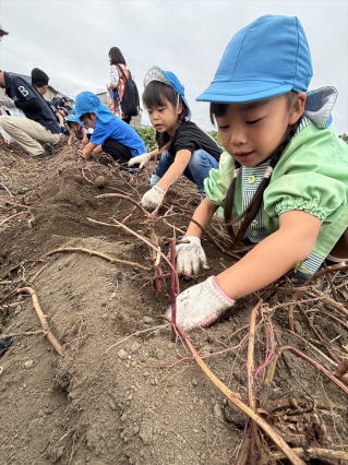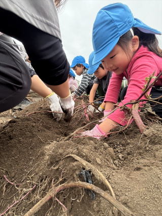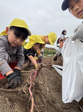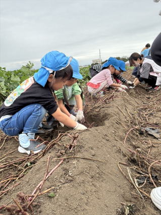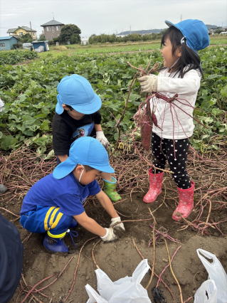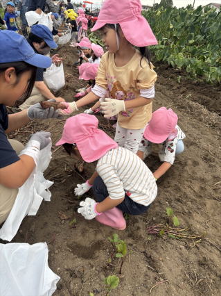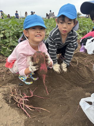 藤岡北高校に行って、お兄さんお姉さんと一緒にさつまいも掘りを楽しみましたよ。 大きいお芋がたくさん採れて大喜びのみんなでしたよ。 たくさん収穫した後は公園に行ってたくさん遊んできましたよ