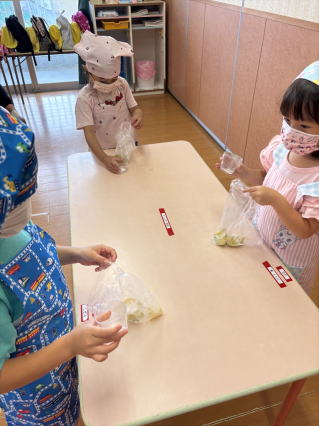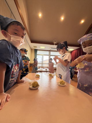 お月見に合わせて、おやつ作りをしましたよ。 さつまいもで茶巾づくりをしました。おやつでおいしくいただきましたよ