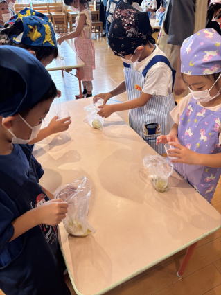 とうもろこしの皮むき体験をしました。 1枚1枚丁寧に皮をむいていましたよ。 出来たとうもろこしは、おやつでおいしくいただきましたよ