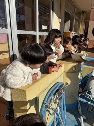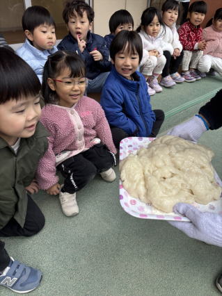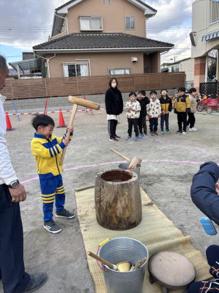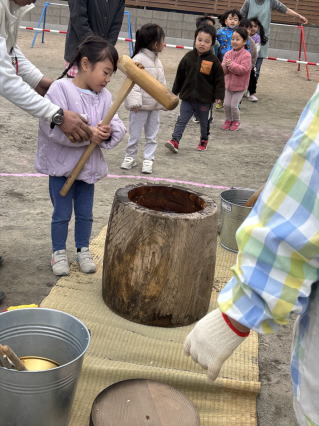 もちつき会が行われました。 もちになる前のもち米の試食から、実際に杵を持ちもちつき体験をしましたよ。 最後は、できあがった大きなおもちにみんなびっくりでしたよ