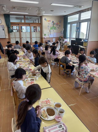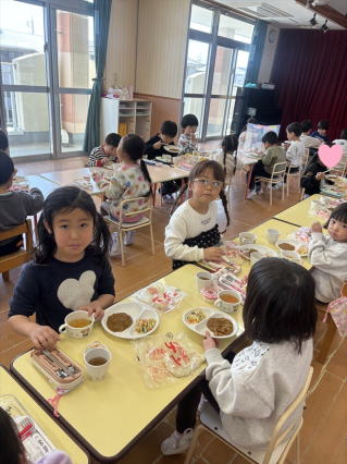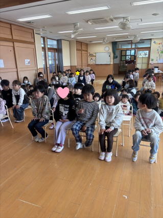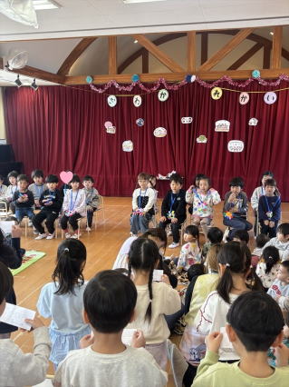 4月になったら1年生になる年長組さんとのお別れ会を行いました。 クイズに歌にみんなで楽しみましたよ。 給食も一緒に食べて楽しい思い出をつくることができましたよ