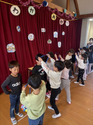 各クラスで作ったこいのぼりの紹介をしてから、 こいのぼりの由来についてのパネルシアターやクイズで楽しく行事に参加できましたよ